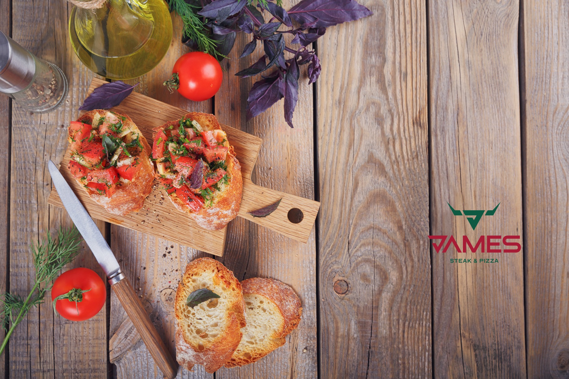 křupavý opečený chléb s čerstvými rajčaty a hoblinkami parmezánu.